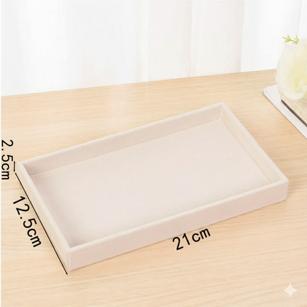 The soft velvety surface helps protect your jewelry from scratches while keeping everything visible at a glance. Its spacious design makes it ideal for bracelets, necklaces, watches, sunglasses, or daily essentials, and it layers easily with other trays for a tidy, customized setup.